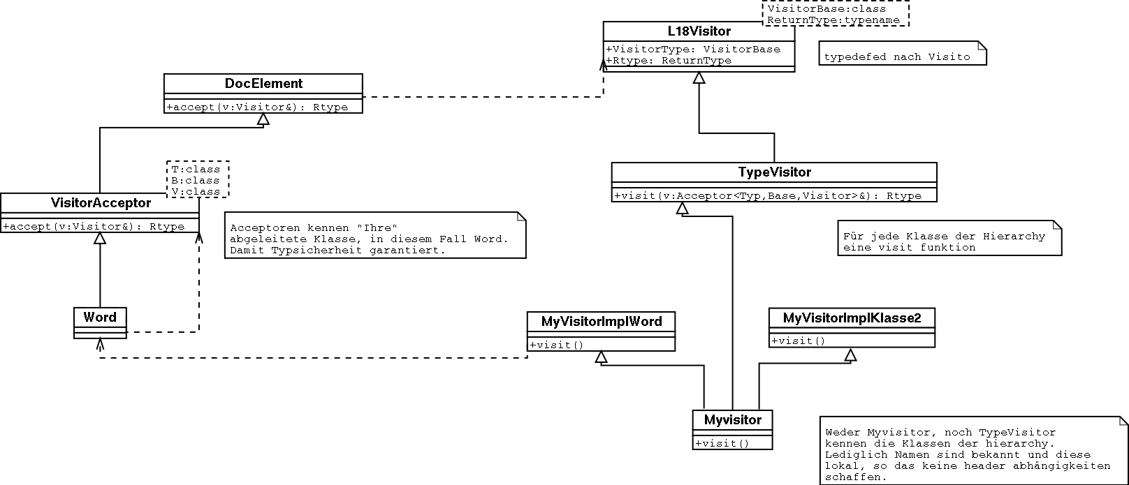 Ansonsten ist die Implementierung recht konventionell. Eine normalerweise direkt von der Basisklasse (hier : DocElement) abgeleitete Klasse wird nun immer von einem Visitoracceptor abgeleitet. Dieser stellt den typsicheren Downcast im Accept bereit. Als template Klasse wäre keine weitere Implementierung erforderlich (also keine zweite Hierarchie wie bei Martin) wenn nicht einige Compiler am Markt bei templates noch Nachhilfe bräuchten. Dies wird ggf. mit einem Macro realisiert, hinter dem sich eine vollständige Spezialisierung des Accept Template verbirgt.